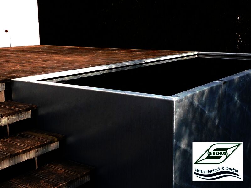 Die Besonderheit unserer Metallwasserbecken besteht aus einem separaten Kunststoffeinsatz, wodurch jede konstante Wasserberührung mit dem jeweiligen Metall verhindert wird. Korrosionsprobleme im Unterwassereinsatz wie z.B. bei Pulverlackierungen können dadurch erst gar nicht entstehen. Wählen Sie zwischem aktuellen Corten, archaischer mattsilbriger Verzinkung oder wählen Sie aus der Fülle von Farben im RAL-Spektrum aus. Sie möchten mehrere Becken stufenförmig miteinander verbinden ? - kein Problem mit unseren eingearbeiteten Schütten in jeder beliebigen Breite.